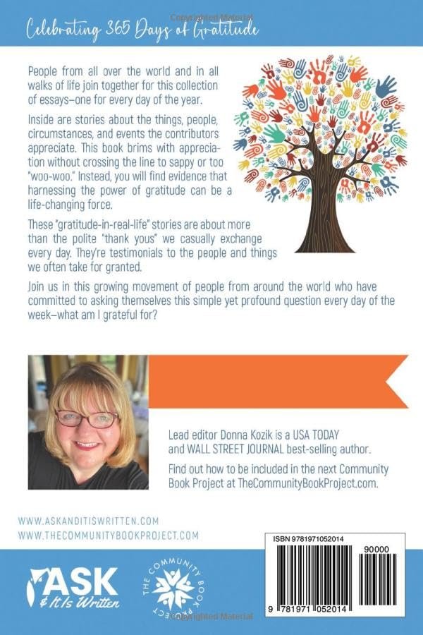 These “gratitude-in-real-life” stories are about more than the polite “thank yous” we casually exchange every day. They’re testimonials to the people and things we often take for granted. Join us in this growing movement of people from around the world who have committed to asking themselves this simple yet profound question every day of the week–what am I grateful for? Lead editor Donna Kozik is a USA TODAY and WALL STREET JOURNAL bestselling author.